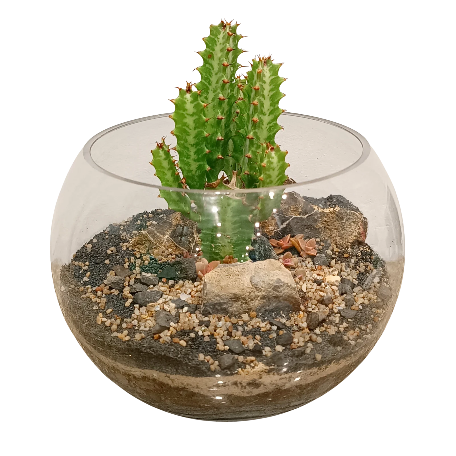 Desertic landscape depicting few rocks and Euphorbia few small succulents with sandy terrain.