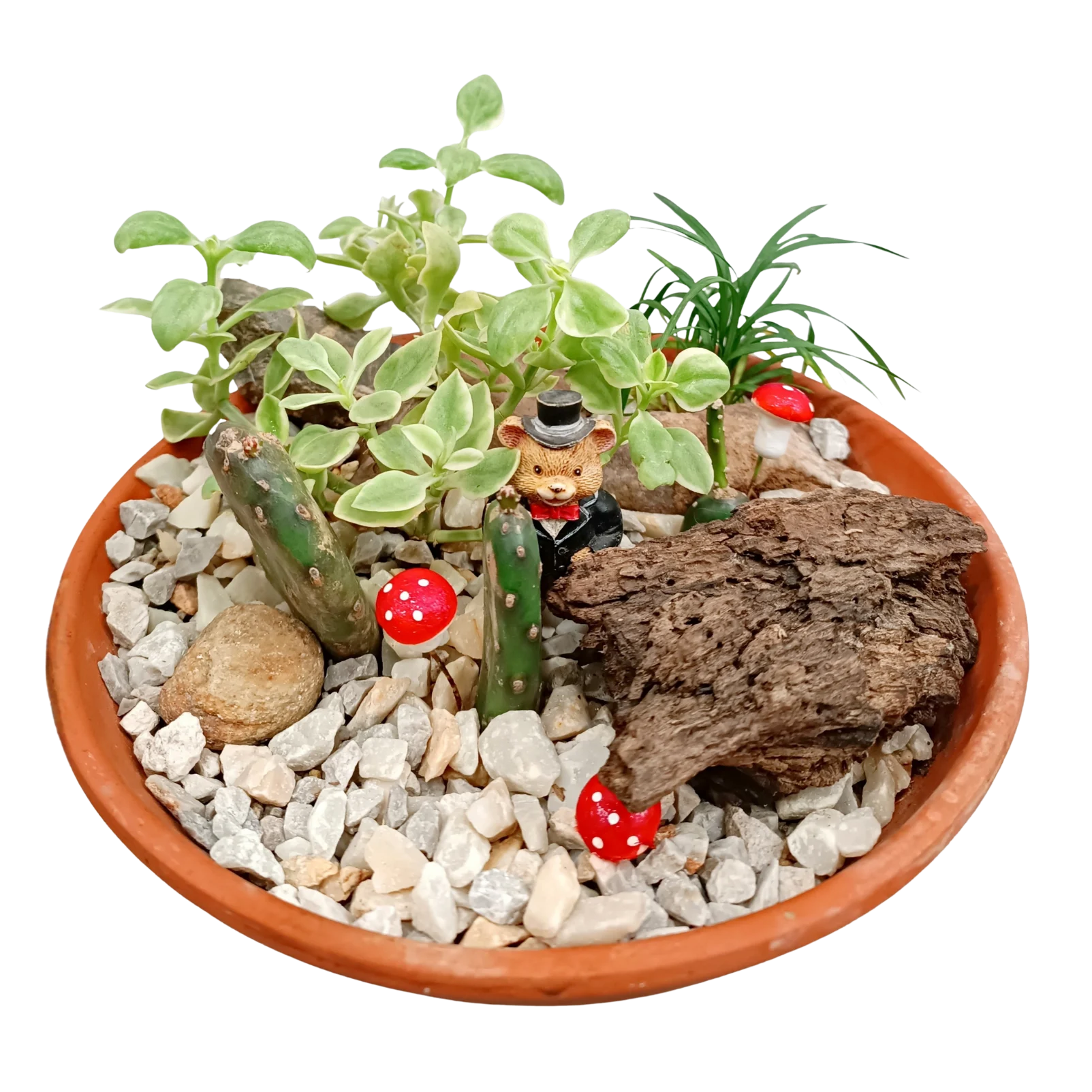 Asparagus Fern, Sedum and kalanchoe landscaping with figurine , stones ans sand.