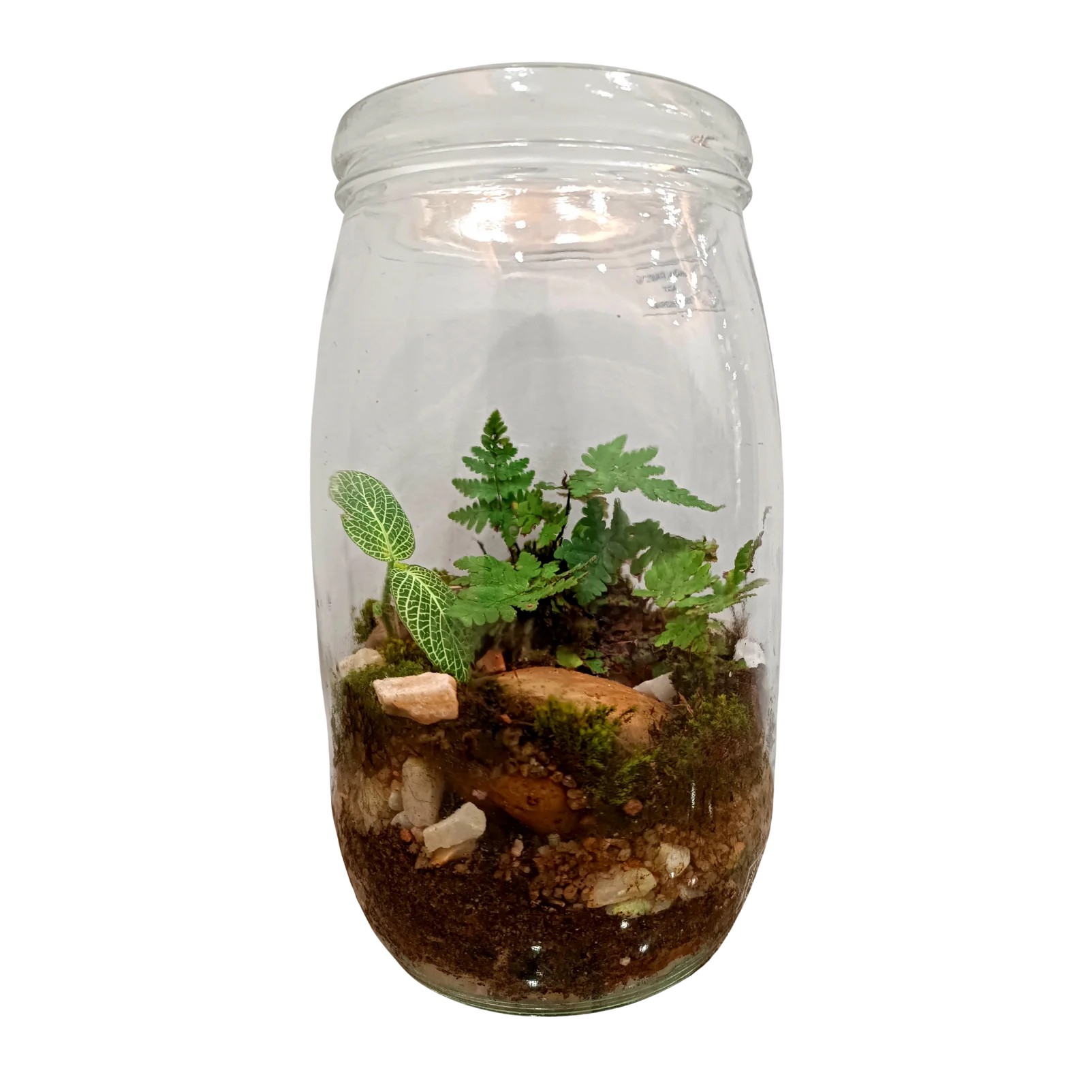 A charming closed terrarium nestled in a clear glass jar, featuring delicate Fittonia with its signature veined leaves. Layered with natural soil stones and moss, this miniature ecosystem captures freshness and calm in abeautifully compact form.