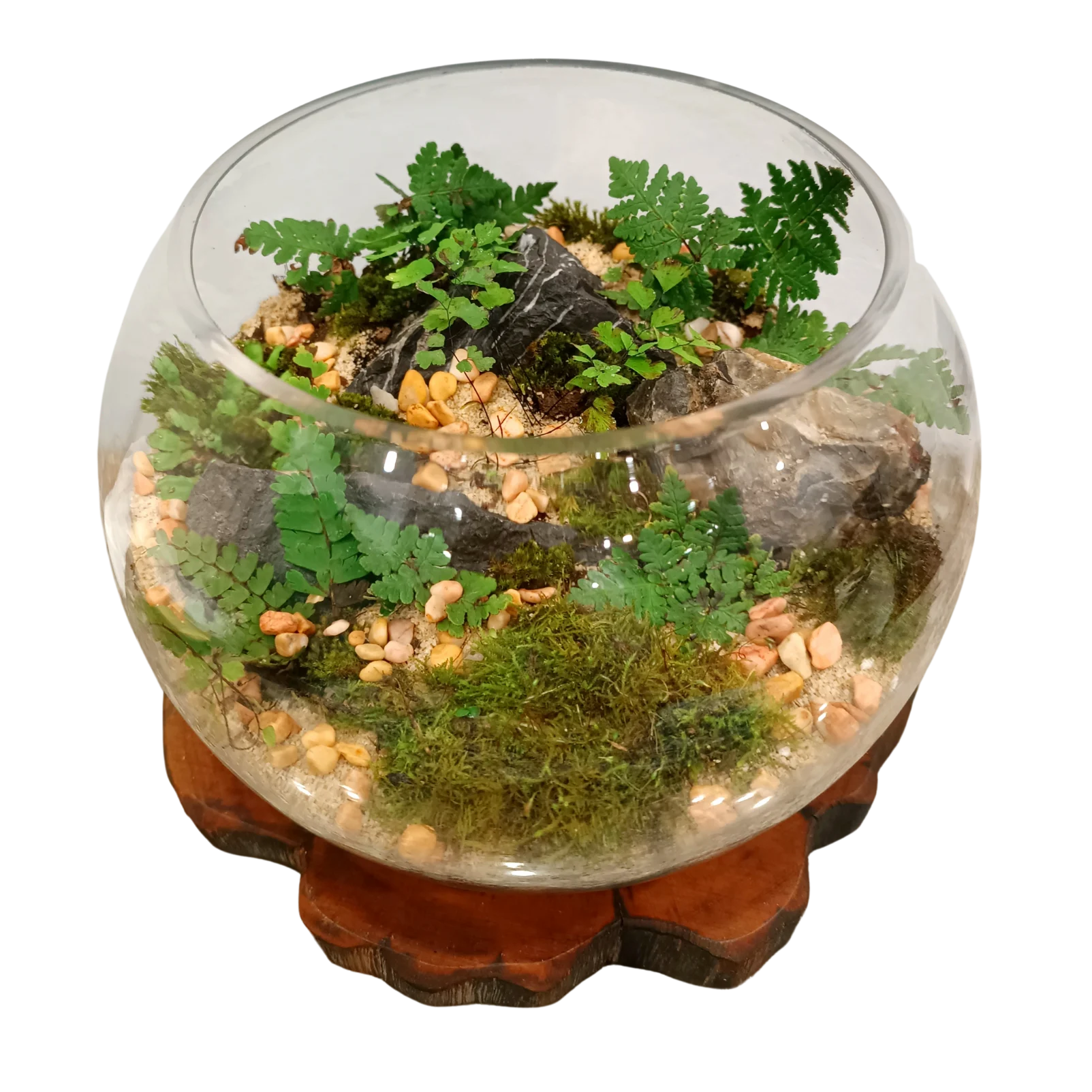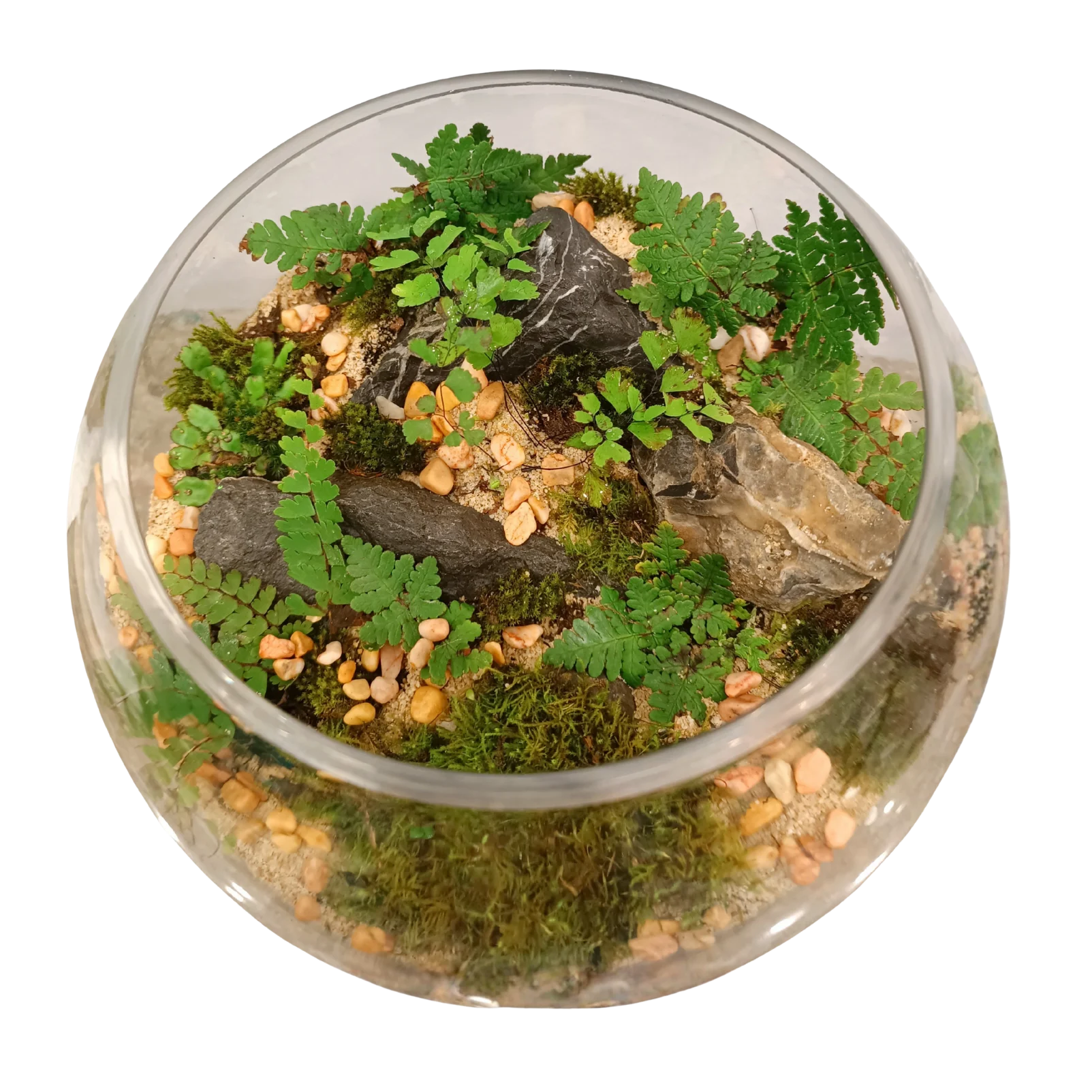 A handcrafted open glass terrarium showcasing delicate fern foliage, soft green moss, and natural stone accents layered over fine sand and pebbles. Designed like a miniature woodland landscape, it brings a calm, earthy charm and a touch of living nature to any space.
