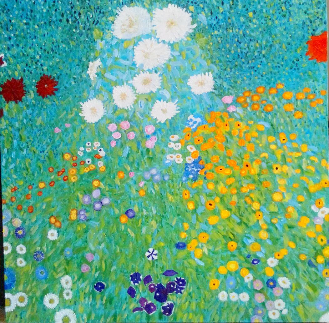 A colorful flower garden painted with rich patterns and golden highlights, celebrating Klimt’s signature decorative style and vibrant, joyful beauty.