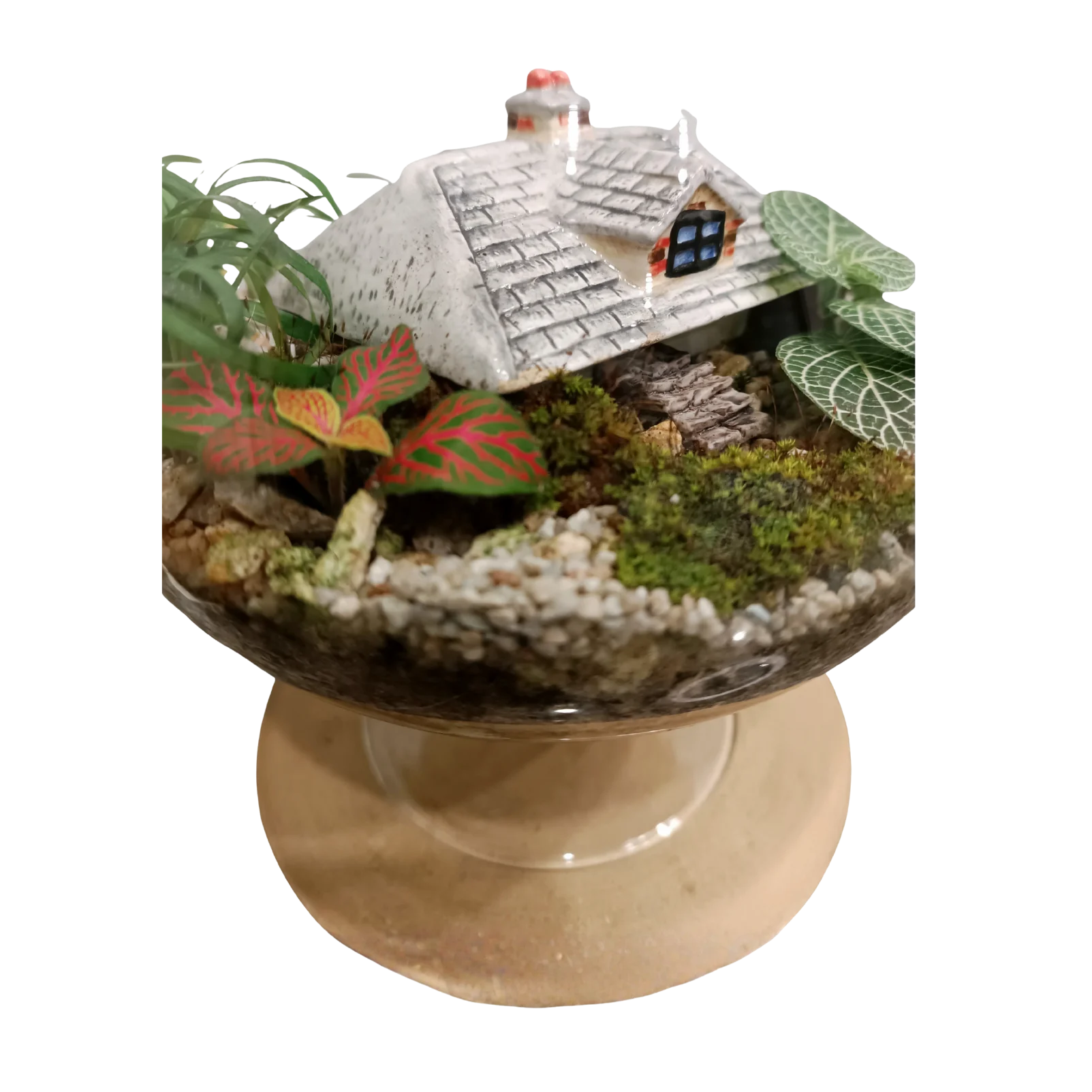 A charming glass terrarium showcasing a miniature cottage nestled among soft moss, delicate fittionia and layered pebbles creating a cozy, storybook landscape sealed in nature.