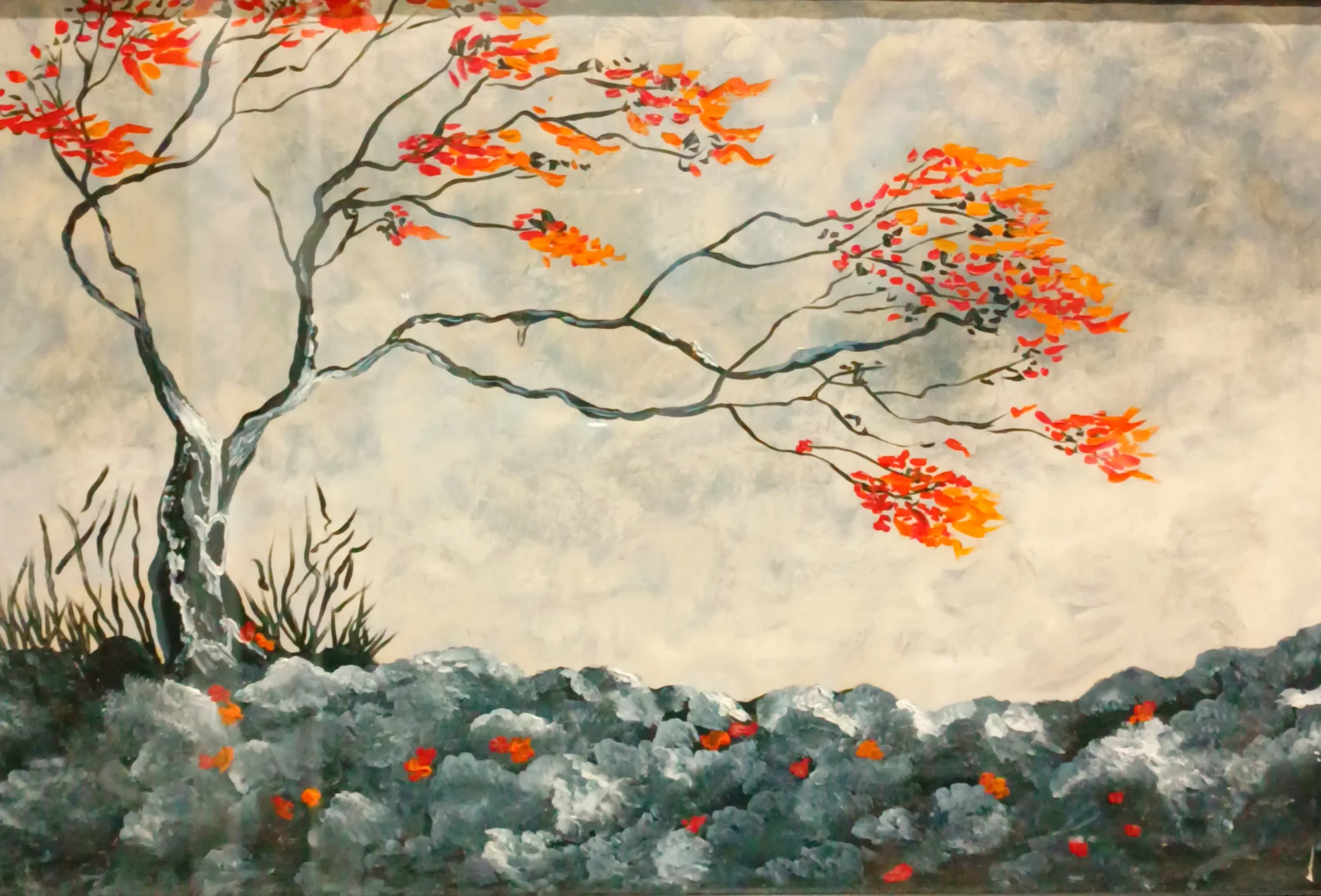 An exclusive art piece painted in the spur of the moment behind a calendar page. A delicate painting of a lone tree with fiery orange and red leaves standing over a rocky landscape. The gentle, flowing branches and muted background evoke a sense of calm and quiet reflection, capturing the serene beauty of nature in transition.