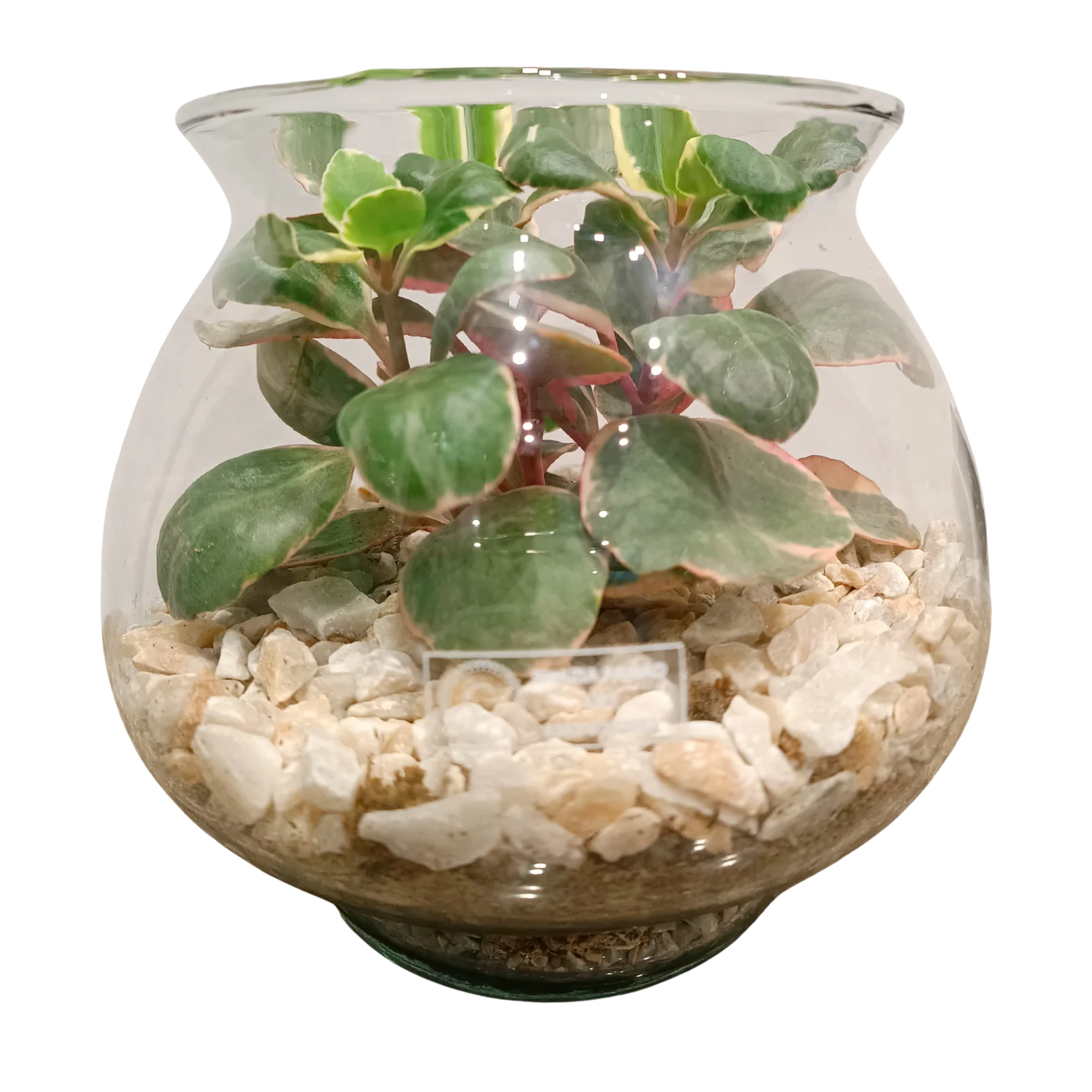 Kalanchoe Blossfeldiana in beautiful glass container with white gravels perfect for a central piece arrangements