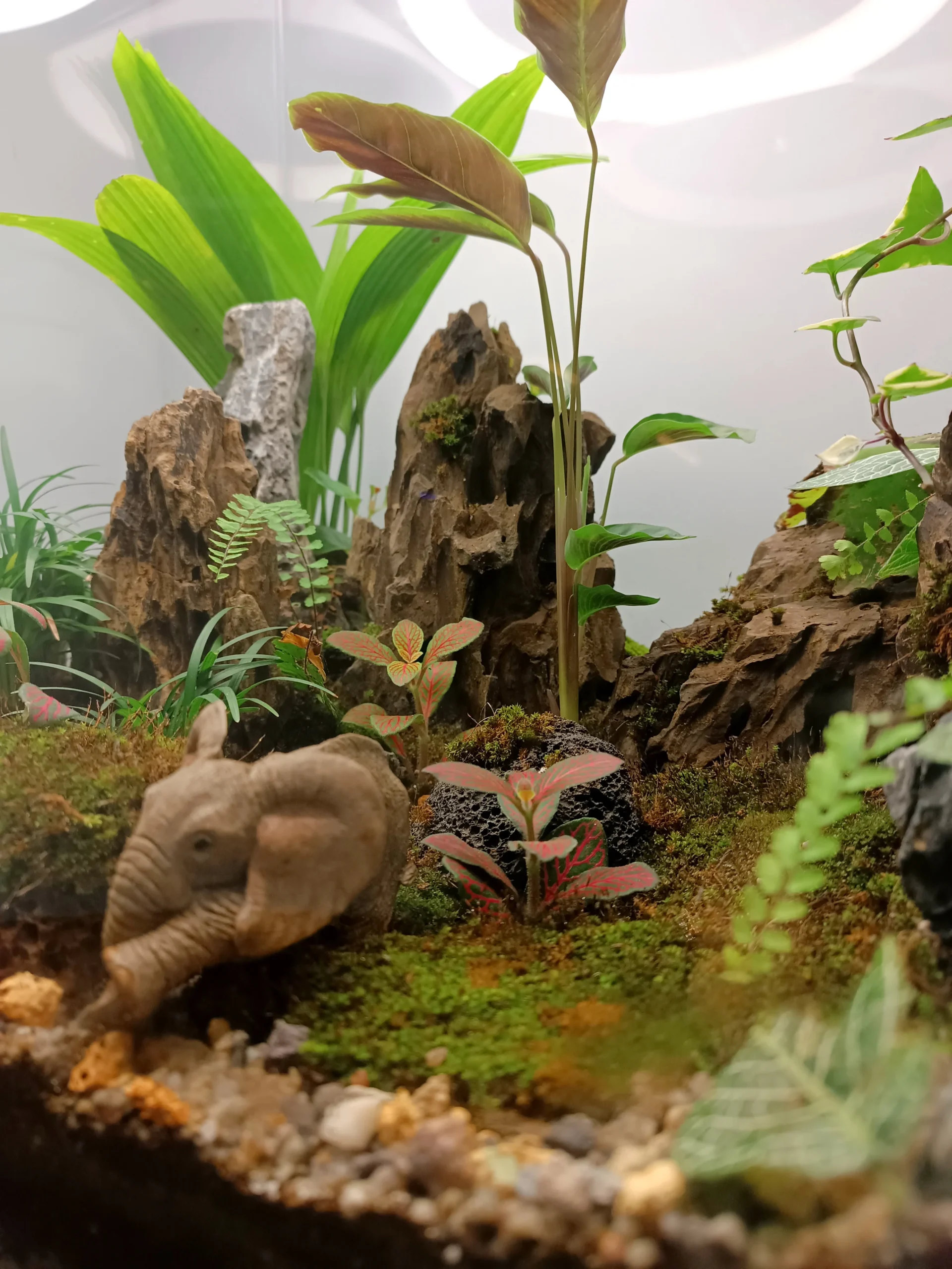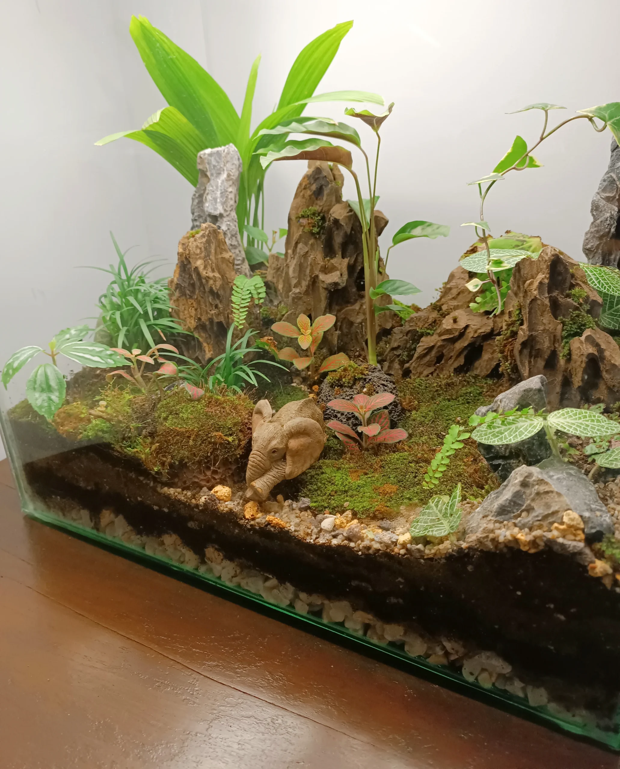 Mountainous ranges with ups and down terrain covered with moss and foliage of palm, Calathea, English Ivy, Fern, Fittonias, pilea, Mondo grass, Begonia.