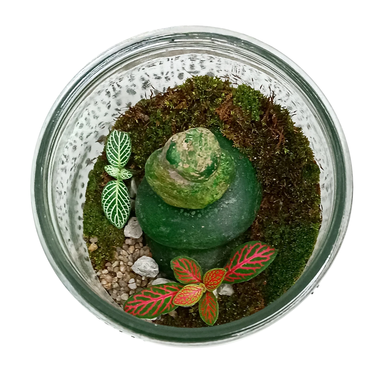 A compact glass terrarium featuring moss, pebbles and delicate fittonia- bringing a calm miniature forest feel to any space.