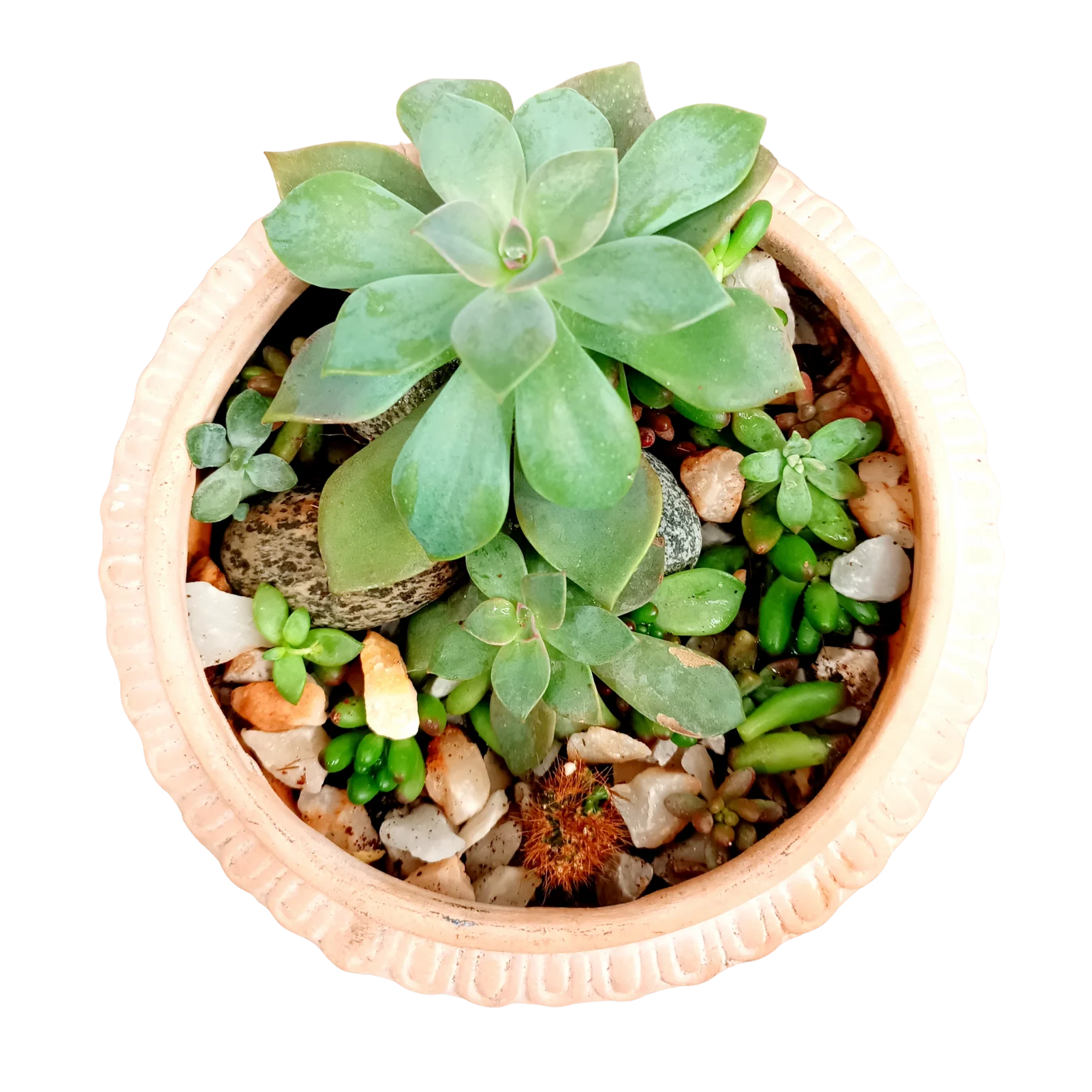 Sedum Rubrotinctum Cactus and Echeveria arranged with rock, stones and gravels in terracota urn.