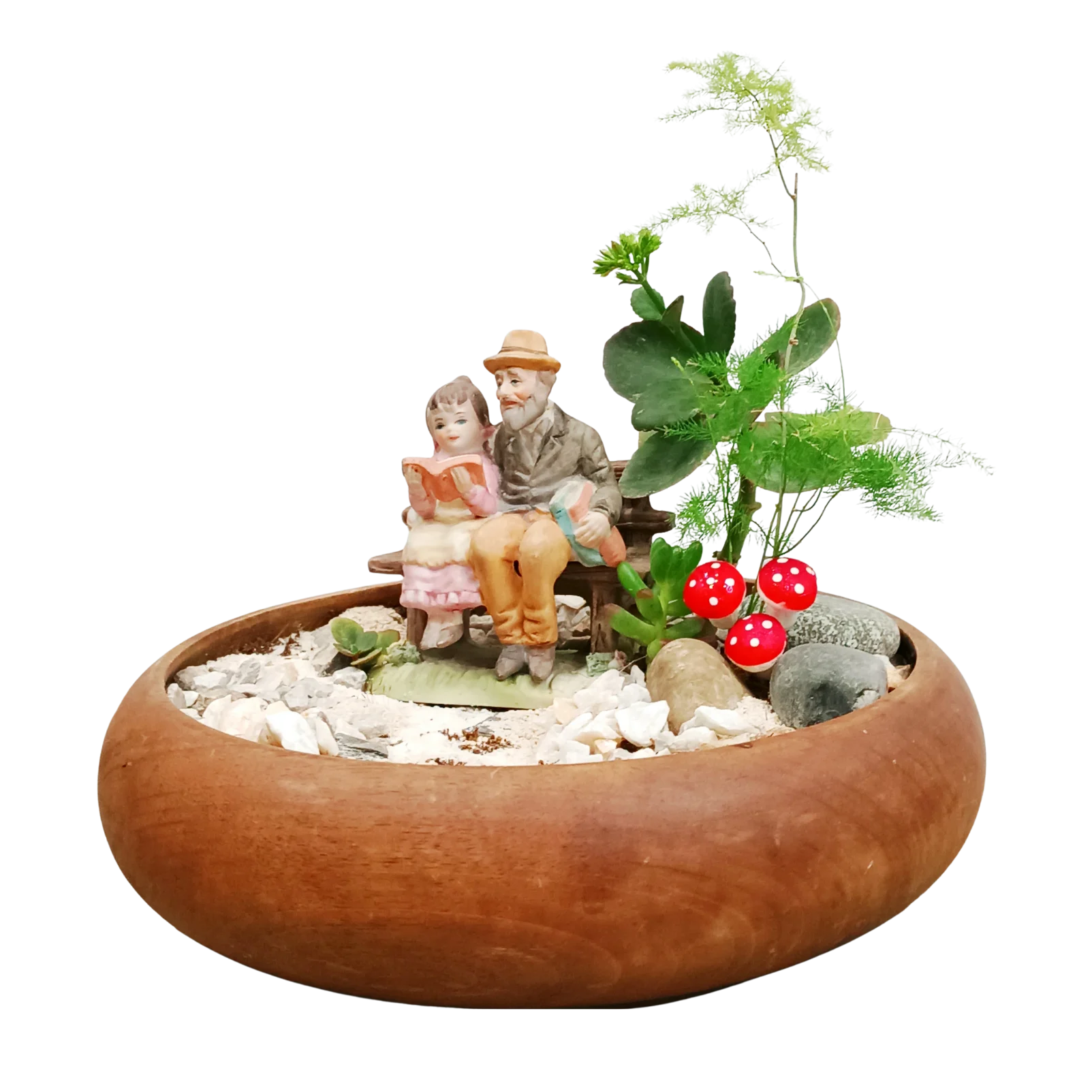 Asparagus Fern, Sedum and kalanchoe landscaping with figurine , stones ans sand.